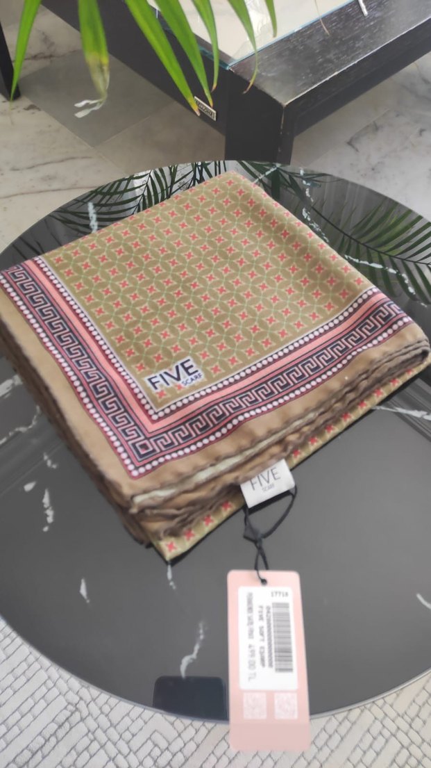 İşlemeli desenlere sahip iki kadın fularından oluşan set. Biri küçük çiçek desenli kahverengi, diğeri koyu renk dalgalı desenlidir. Lop'Res marka etiketlidir.
