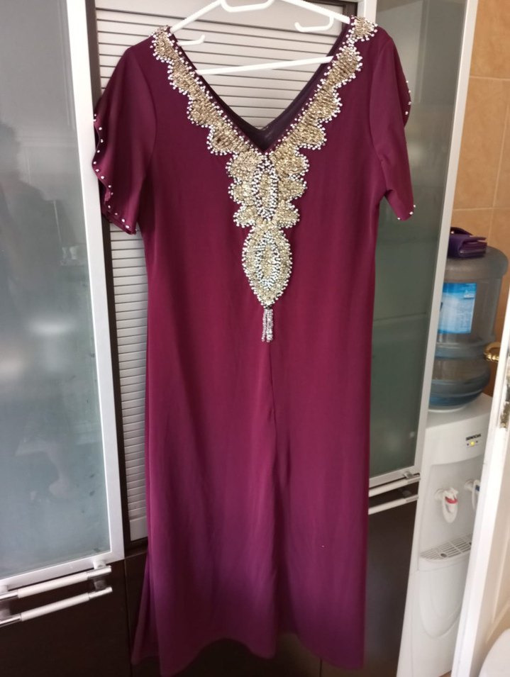 Bordo abiye elbise, V yaka ve kısa kolludur. Bol kesim olup parlak boncuk işlemeleriyle süslenmiştir. Bohem tarzı düğünler için uygundur. Koltuk arası 53.5 Boy 96