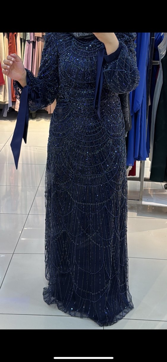 İşlemeli Boncuk Detaylı Lacivert Uzun Abiye Elbise