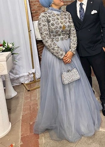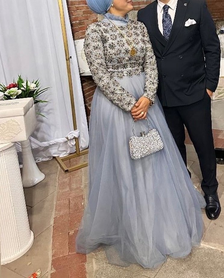 Boncuk işlemeli, yüksek yakalı ve uzun kollu, klasik ve modern tarzda, gri renkli, oturan kesim uzun abiye elbise.