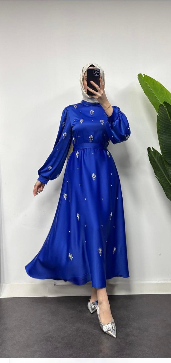 Parlak mavi renkte, yüksek yakalı ve uzun kollu, işlemeli ve boncuk detaylı, salaş kesim abiye elbise. Düğün için uygun, mütevazı tarzda. Aynısının lacivertti rengi hiç giyilmemiş