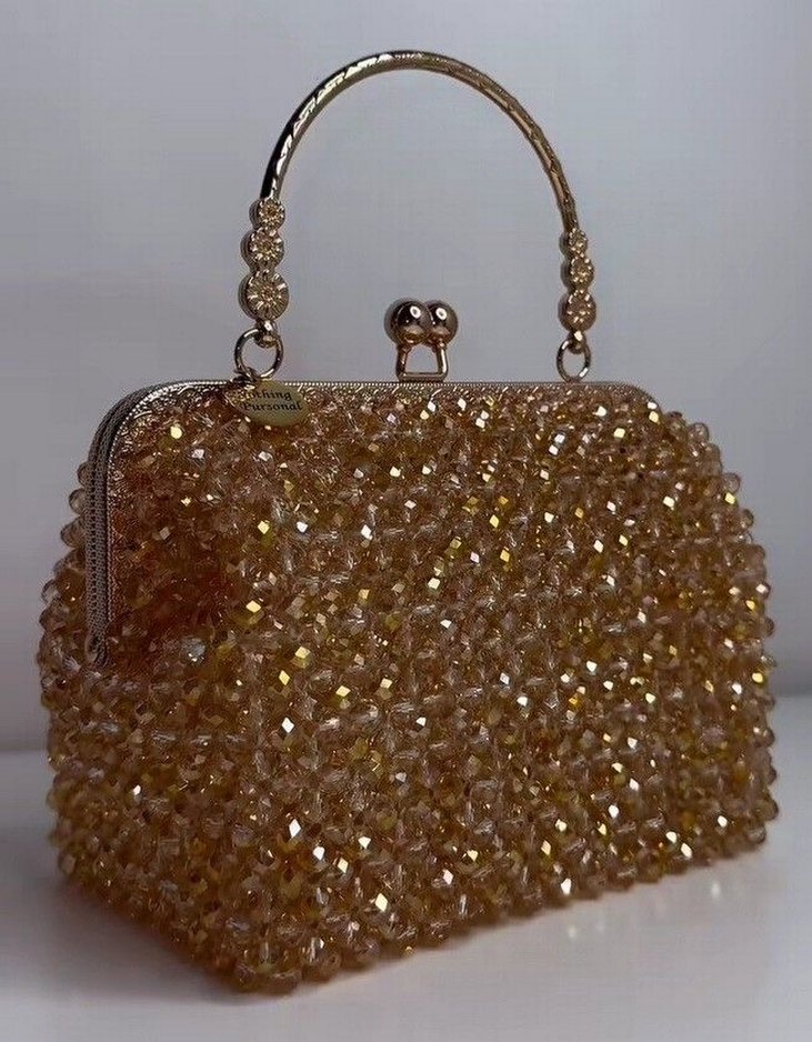 Parlak altın renginde, boncuk işlemeli ve örgü dokulu kadın çantası. Düğünler için uygun, gösterişli ve bohem tarzda. Sapı süslü metal detaylıdır.