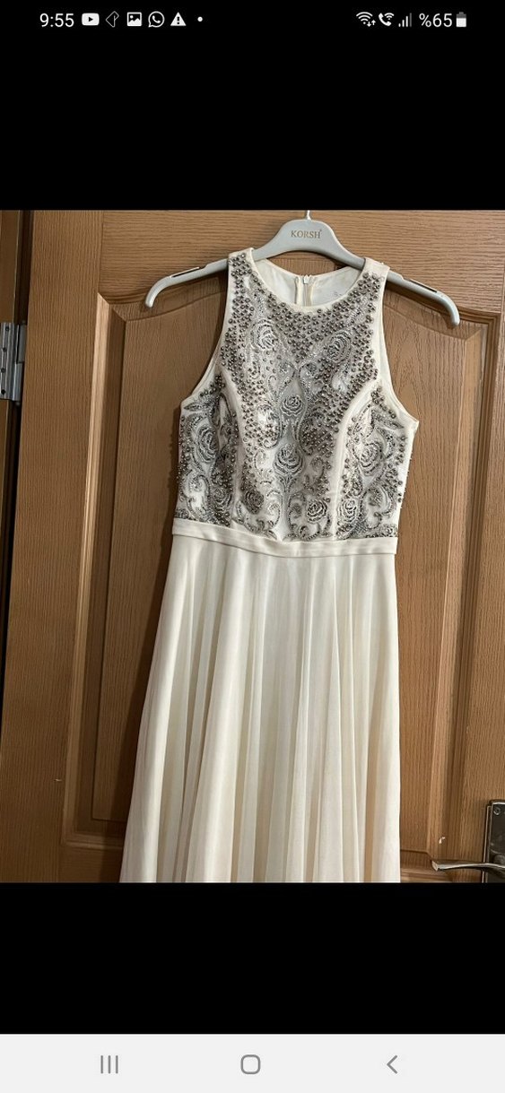 Kolsuz, işlemeli ve boncuk detaylı gri motiflerle süslenmiş beyaz uzun abiye elbise. Oturmalı üst kısmı ve şık etek detayıyla düğünler için uygun.
