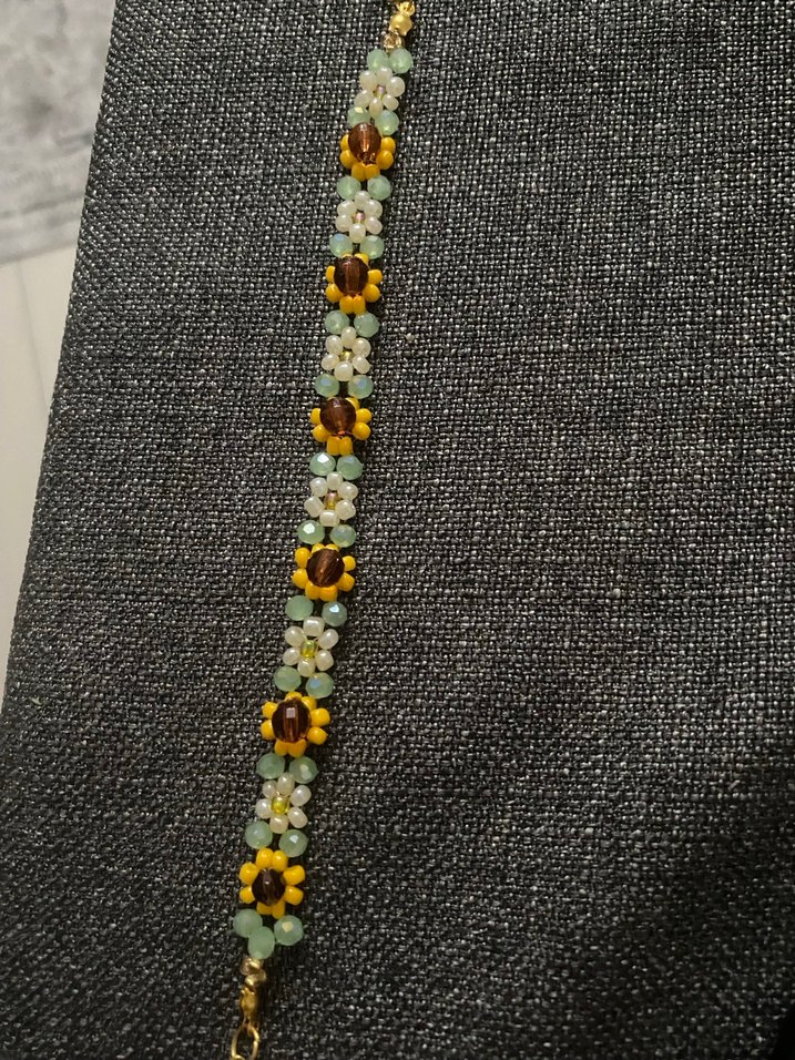 Gri zemin üzerine çok renkli işlemeli boncuk çiçekler içeren bohem tarzda kadın bileklik, günlük kullanım için uygun.
