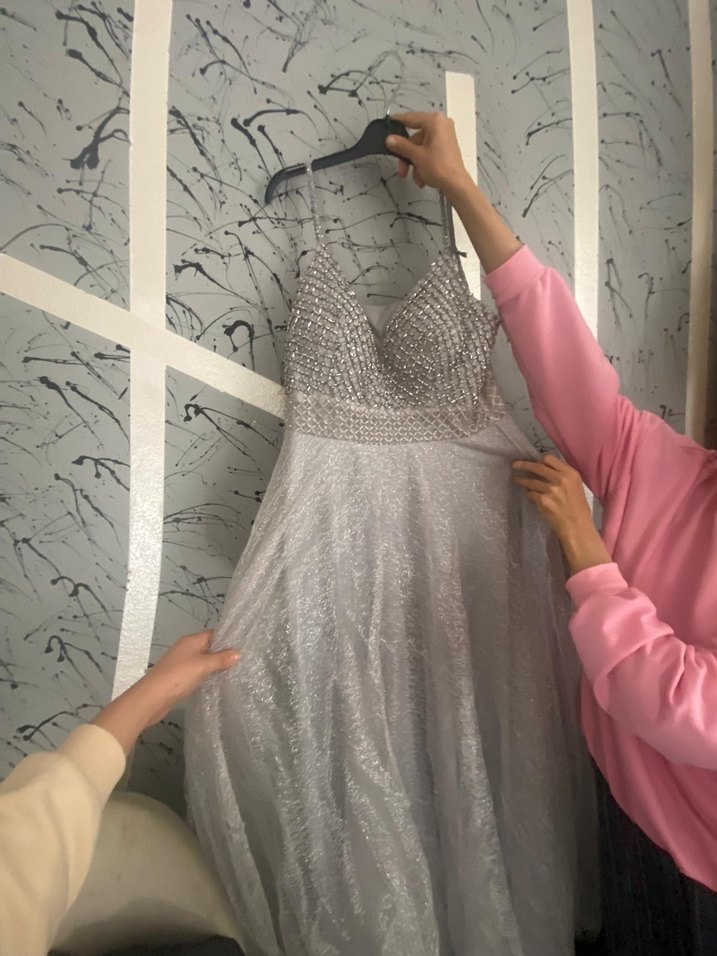 Bej renkli, askısız, bol kesim uzun abiye elbise, boncuk işlemeleri ve nakış detaylarıyla düğün ve şık etkinlikler için uygun. sıfır etiketli ürün