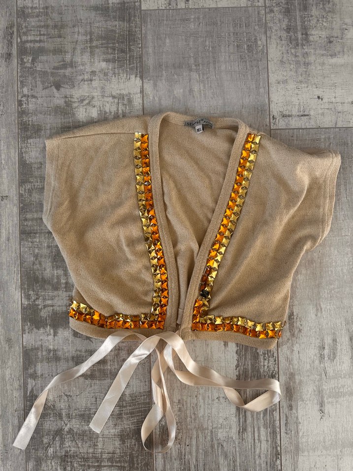 Bej renkli, işlemeli ve boncuk detaylı, kolsuz, halter yaka bolero. Bol kesim ve parlak tekstil kumaştan bohem stil bolero. ✨
