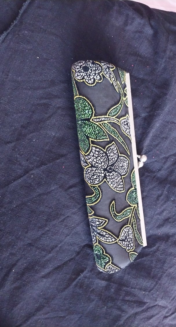Kadın portföy çanta, koyu renkli sentetik kumaş üzerinde işlemeli çiçek desenleri ve boncuk detaylarına sahiptir. Vintage, bohem tarzda, düğün için uygundur.