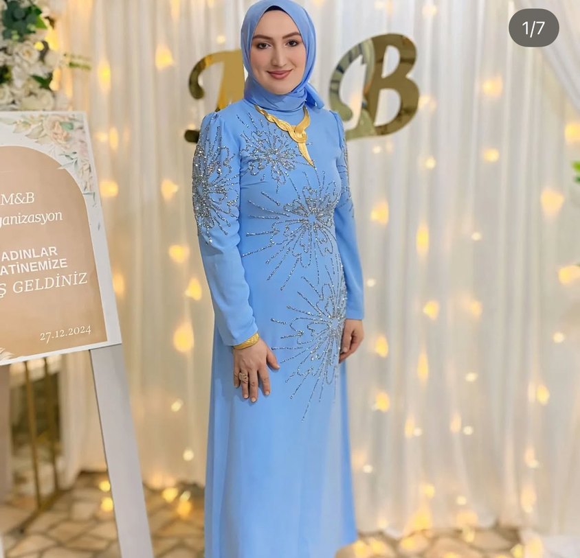 İşlemeli ve boncuklu detaylara sahip, V yakalı ve uzun kollu açık mavi uzun abiye elbise. Düğünler için uygun, rahat kesim ve mütevazı tarzda. Krep kumaştır salınıda verebılırım