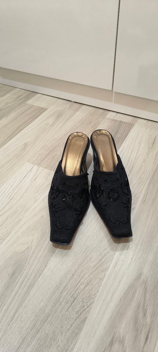 Siyah dolgu topuklu terlik, işlemeli ve boncuk detaylı, kauçuk tabanlı. Klasik ve minimalist tarzda, düğünler için uygun.