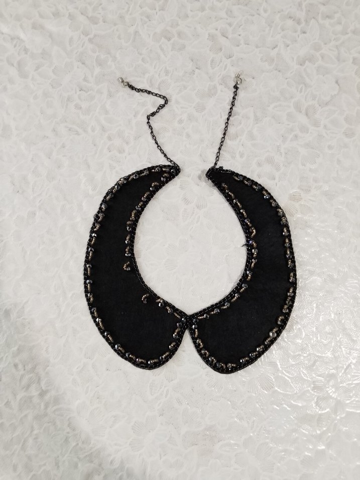 İşlemeli detaylara ve boncuklu kenarlara sahip siyah elbise yakası. Parisian avant-garde tarzını yansıtır. Elbiselerinize şıklık katacak ve aynı elbiseyi yakalı ve yakasız giyerek 2 farklı elbise giymiş olacaksınız.