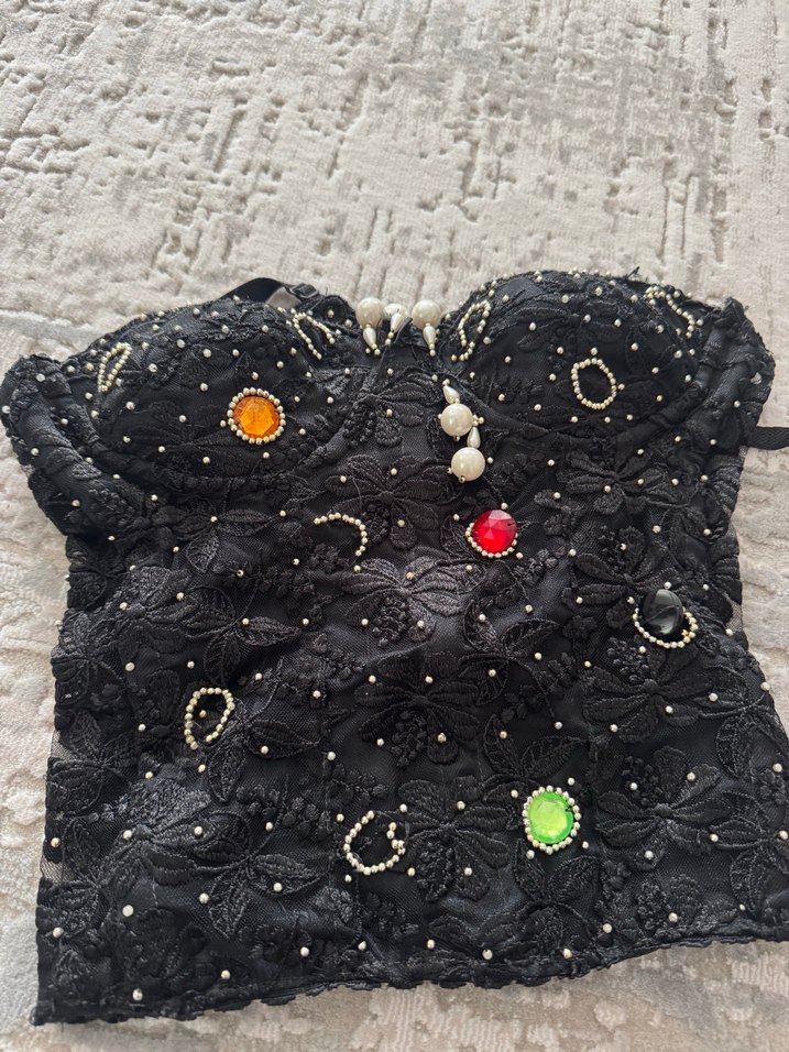 İşlemeli çiçek desenleri ve boncuk detaylarıyla süslenmiş, renkli taş aksanlı siyah straplez bustiyer. Kolsuz ve uzun boy, parti için uygun.