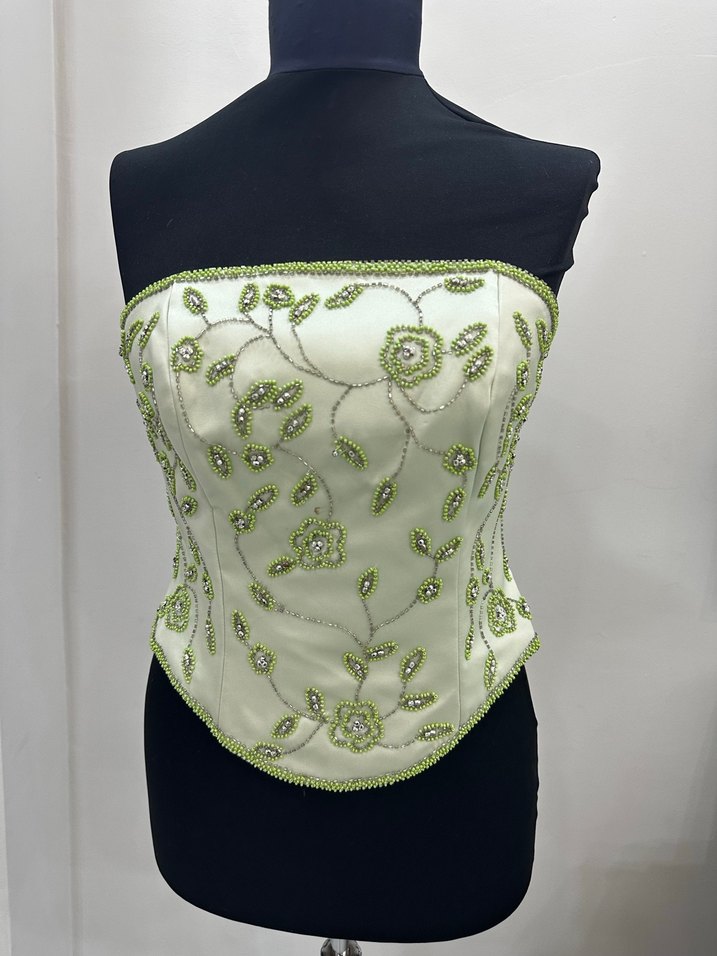 kumaş üzerine boncuk işlemeli, straplez ve kısa kesim, oturan mini büstiyer. Düğünler için uygun, kolsuz tasarım.
