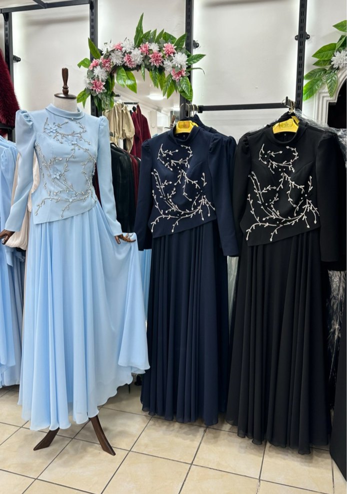 İşlemeli Boncuklu Uzun Kollu Abiye Elbise