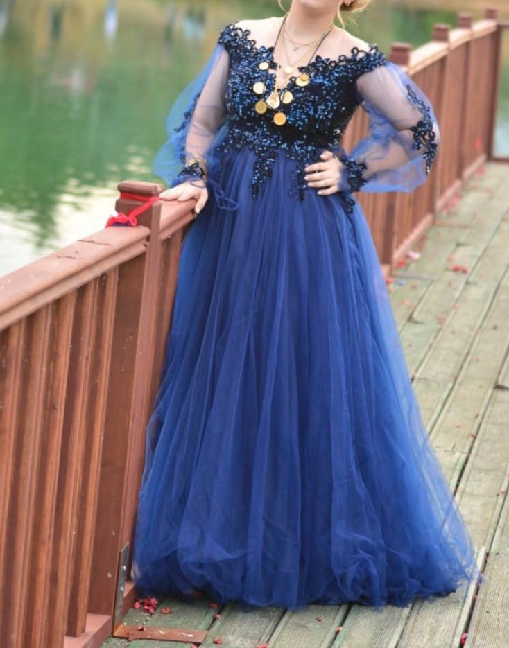 Klasik zarafette, boncuk işlemeli straplez yaka ve uzun tüllü kollarla süslenmiş, fitted kesimli koyu mavi nişan elbisesi. Bir kez eltimin düğününde giyindim harici hiç giyilmedi yıkamadan geldiği gibi posetine koydum ve duruyor 75 -78 kiloya kadar cok rahat giyebilir diye düşünüyorum üstü kilodaki kişilerde terzide arkasına gelin sırtı bağlama yaptırabilir cok cüzi rakama yapılan bir işlem pazarlık payı vardır