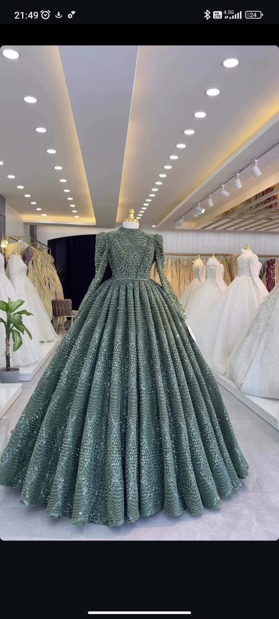 Boncuk işlemeli, parlak yeşil uzun abiye elbise. Tekne yaka ve uzun kollu, klasik ve modern tarzda, düğün için uygundur. ✨