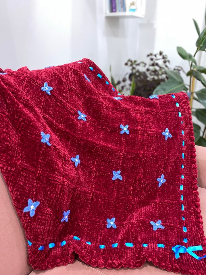 Bordo renkteki bu battaniye, renkli mavi işlemeli çiçekler ve dekoratif kenarıyla sıcak ve şık bir dokunuş sunar.kadife ipten yapılmıştır