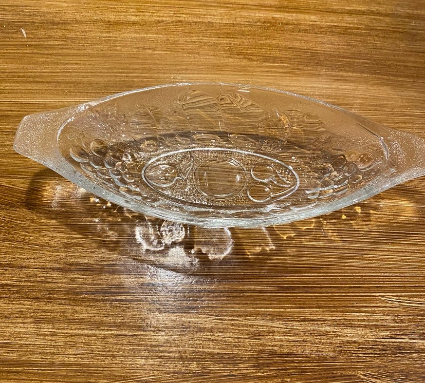 İşlemeli desenli, parlak cam servis tabağı, klasik bir dokunuş sunar ️.banane split. Muzlu tatlı sunum tabagi.. hiçbir kusuru yoktur çok az kullanılmıştır iki ya da üç kez Almanya’dan alındı.. Altı adet fiyatıdır ..