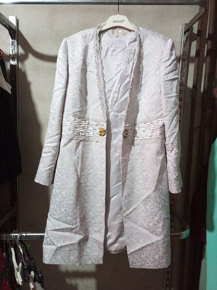 Kadınlar için düğmeli, işlemeli detaylı, uzun kollu ve uzun boylu klasik kesim beyaz kaban. İpeksi kumaştan