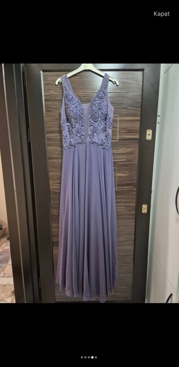 Mor renkte, V yakalı ve kolsuz uzun abiye elbise, işlemeli dantel detaylara sahiptir. Düzenli kesim ve modern klasik tarzıyla düğünler için uygundur. ( 1 defa kullanıldı )