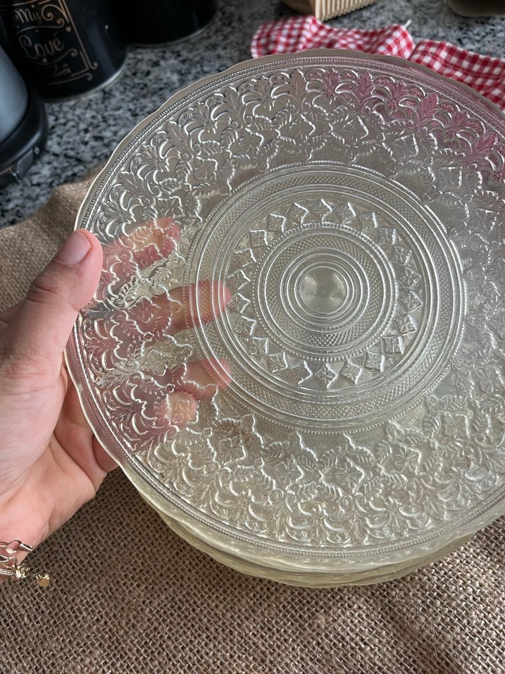 İşlemeli desenlere sahip beyaz cam tabak, geleneksel stilde detaylı süslemeler içerir. Şık servis için uygundur.severek kullandığım bir takımdı kullanmaya bağlı bi kaç yerinde çizileri mevcut
