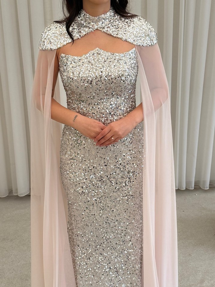 İşlemeli, straplez yaka ve drapeli şeffaf pelerin detaylı, klasik zarafette uzun, vücuda oturan abiye elbise. Düğünler için modern ve göz alıcı bir seçim. ✨