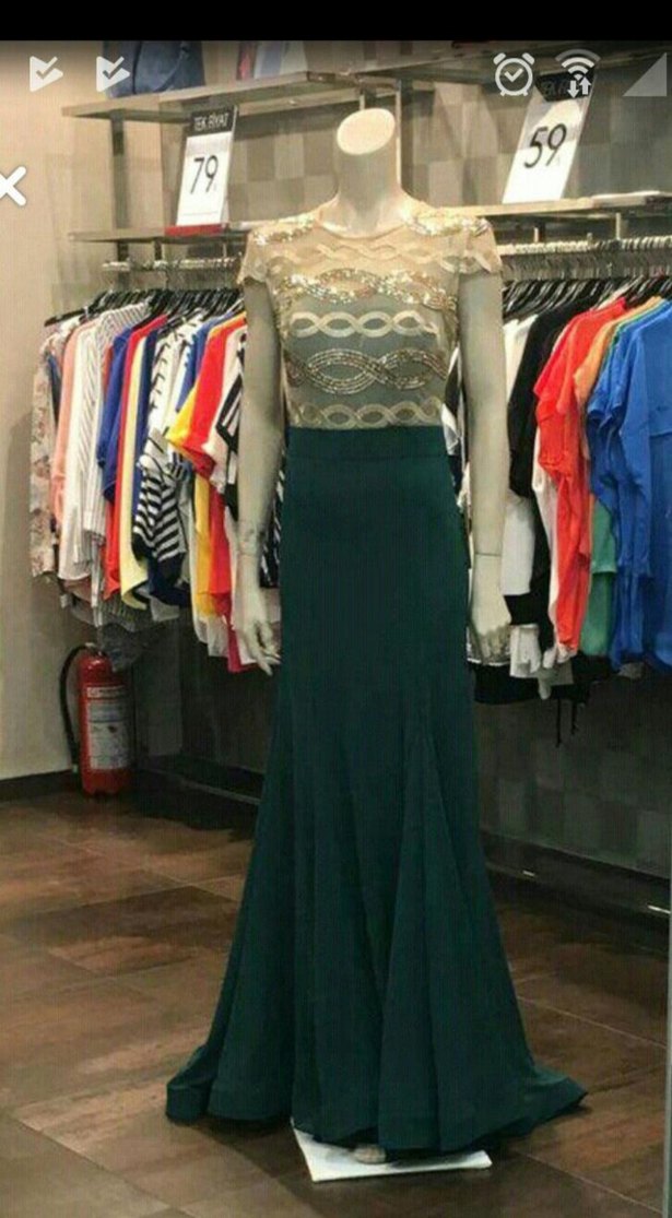Drapeli ve işlemeli, uzun ve yeşil renkte, tekne yaka ve kolsuz tasarıma sahip klasik kesim abiye elbise. Düğünler için uygundur.