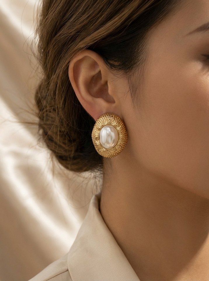 Günlük kullanıma uygun, işlemeli desenli ve düğme detaylı parlak altın rengi midi küpe. ✨