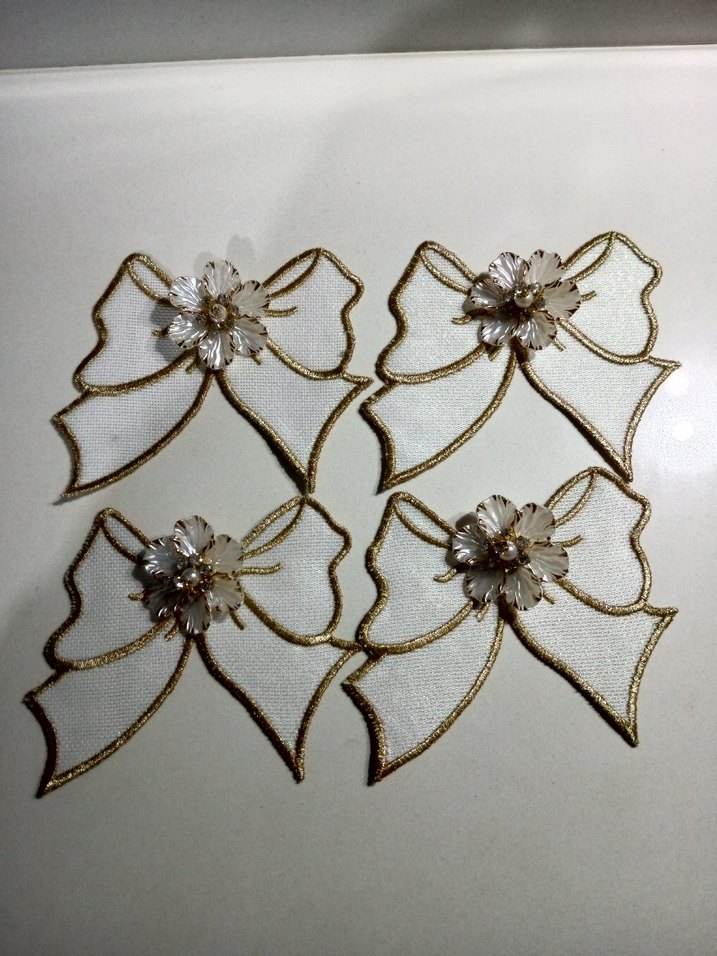 Dört adet işlemeli fiyonk şeklinde beyaz kadın broş seti, parlak detaylarla vintage düğünler için uygundur. Her broşta klasik stile zarif çiçek detayları bulunur.