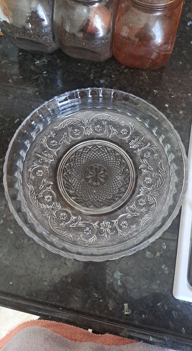 Gri renkli, işlemeli çiçek desenli klasik cam tabak. Dayanıklı ve şeffaf malzemeden üretilmiştir. ️