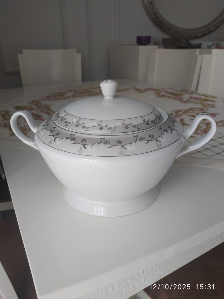 İki kulplu beyaz çorba kasesi, gri işlemeli çiçek desenleriyle kapaklı, bi defosu yoktur kullanmadığımdan satıyorum #porselençorbatenceresi #tencere #yemektakımıtenceresi #çorbatenceresi