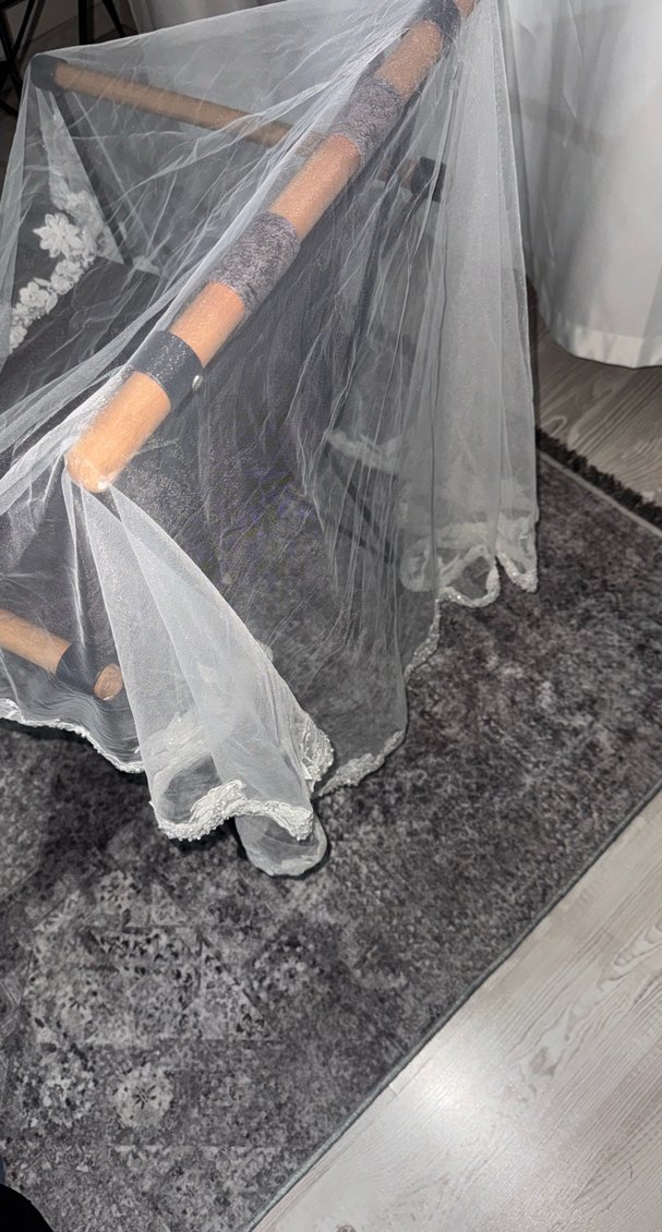Gri renkte gotik tarzda, işlemeli tül duvak Kenarlarında ince detaylı işlemeler ve hafif, şeffaf kumaş bulunur.