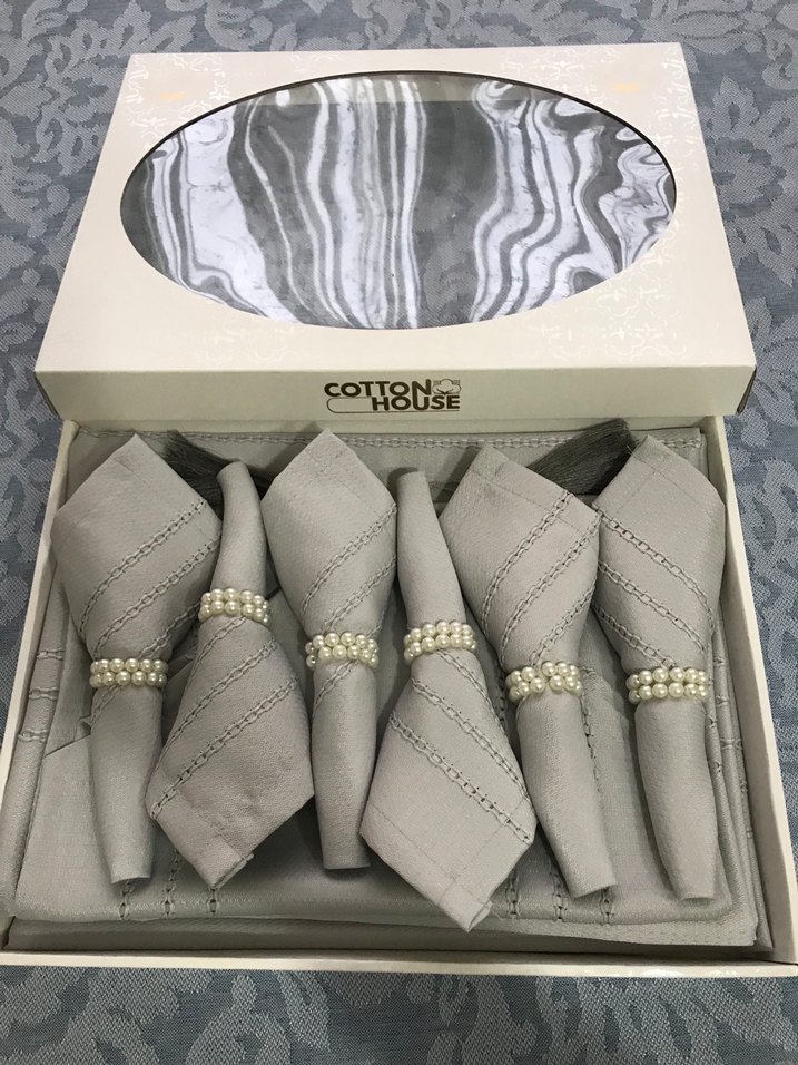 Gri işlemeli peçeteler ve inci peçete halkaları içeren modern klasik tarzda şık bir masa seti. ️