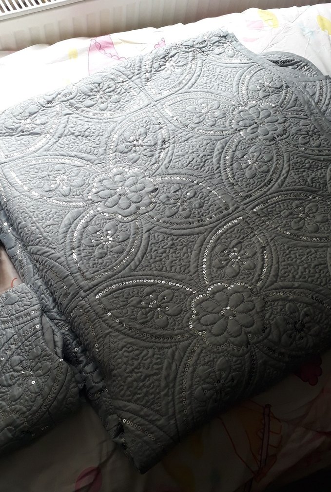 İşlemeli detaylar ve ince payet süslemeleriyle gri renk yatak örtüsü, dokulu bir görünüm sunar.