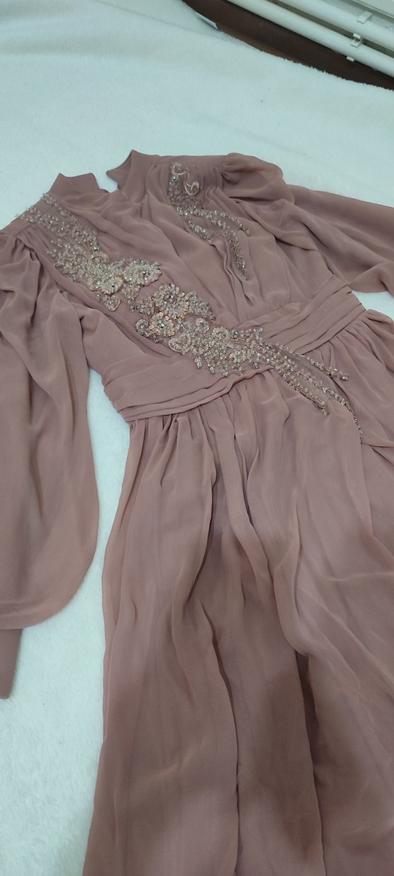 Gül kurusu renk, işlemeli detaylar ve tekne yaka ile uzun, bol kesim bohem abiye elbise. Uzun kolları ve parlak kumaşıyla düğünler için uygun. az kullanıldı büyük beden alındı ama 38 bedene uygun tadilat yapıldı. iki defa Nişanda giyildi sadece