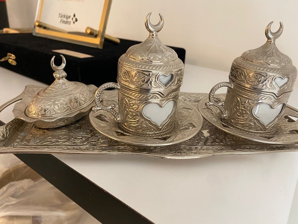İşlemeli gümüş kapaklı fincan ve tabağı, kalp desenli kesimlerle süslenmiştir. Fincanın içi beyazdır, geleneksel ve şık bir tasarıma sahiptir. defosu yoktur ☕