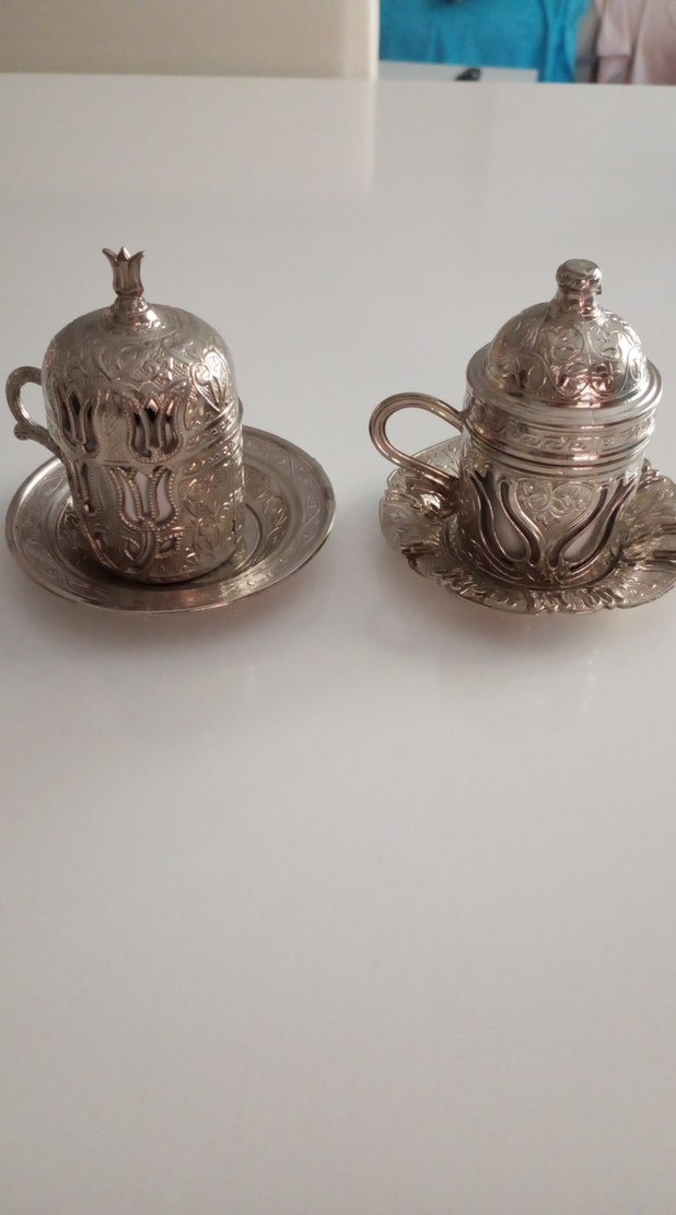Gümüş otantik desenli beyaz renkte, işlemeli detaylara sahip Türk kahvesi fincan seti.Mardinden hediye geldi, Kapaklı ve kulplu tasarımı ile geleneksel bir görünüm sunar. ☕