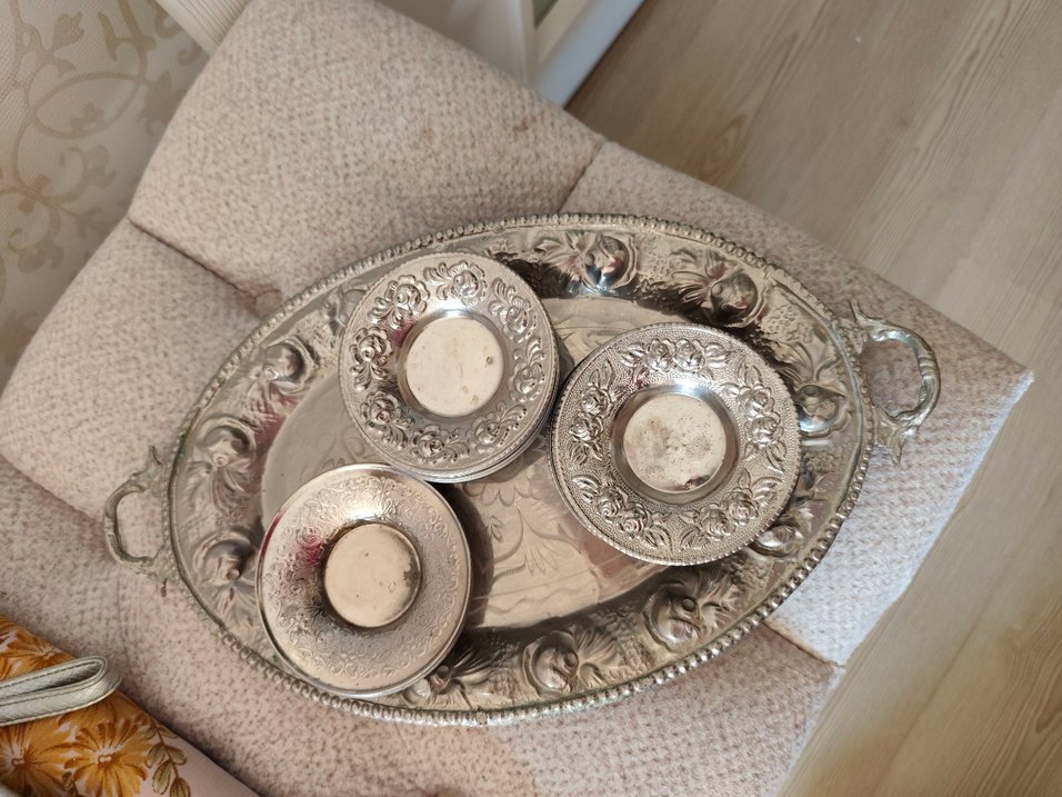 Geleneksel tasarımlı, işlemeli desenlere sahip gümüş renkli tabak ve tabaklar seti, gri-beyaz tonlarında. ️