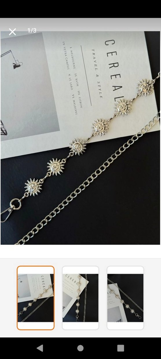 İşlemeli güneş desenleri ve zincir detaylarıyla gümüş renkli, parlak yüzeyli bohem tarzda vücut zinciri.