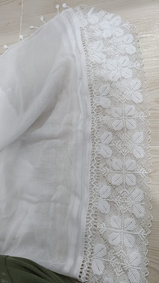 Yumuşak tekstil kumaştan, uçlarında ince dantel detayları bulunan beyaz bohem tarzı kadın şalı.