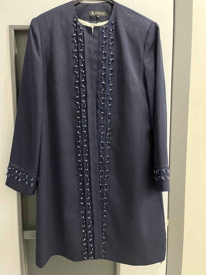 Lacivert uzun kadın takım.İşlemeli ve incili detaylarla süslenmiştir. Ürün uzun kollu ve kesimi rahat ceket beyaz sıfır kol terletmeyen kumaş içlik ve pantolondan oluşmaktadır.Alvina markadır.Sadece bir kaç saat düğünde giyilmiştir.Sıfır ayarındadır.