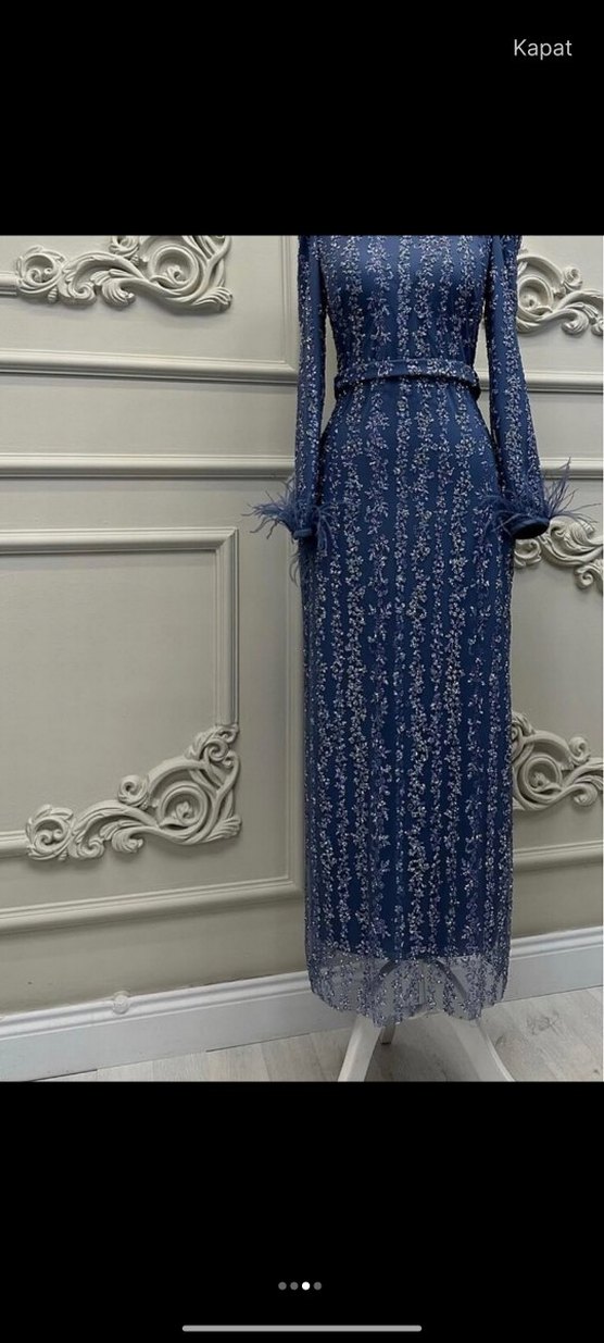 İndigo renkte, işlemeli ve drapeli uzun abiye elbise. Uzun kollu, tekne yaka ve tüy detaylı, düğünler için uygun şık model. ✨