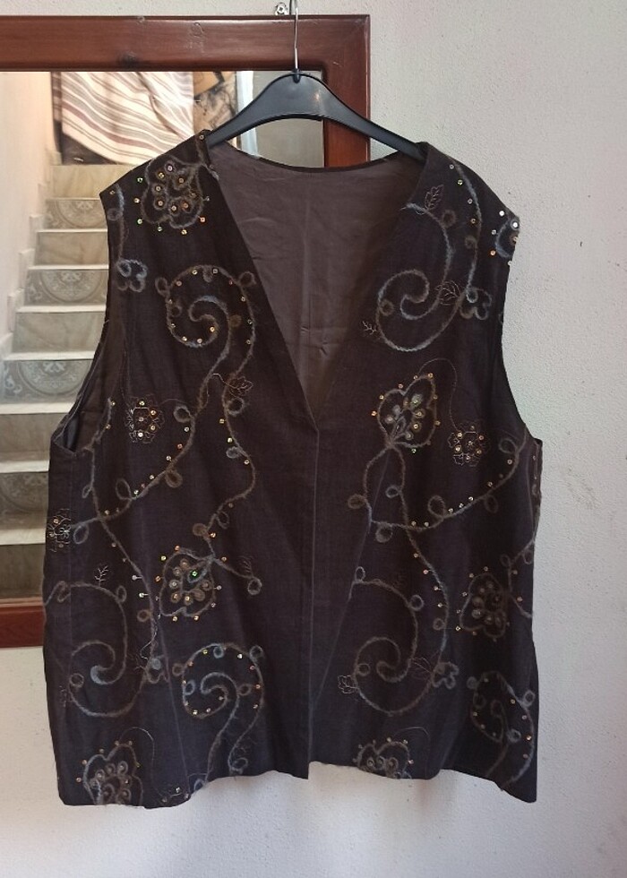 BÜYÜK BEDEN İŞLEMELİ KADİFE YELEK HİÇBİR YIRTIĞI SÖKÜĞÜ DEFORMESİ RENK SOLMASI YOKTUR İKİ KOLTUK ARASI ÖLÇÜSÜ 60 CM BOYU 70 CM DİR