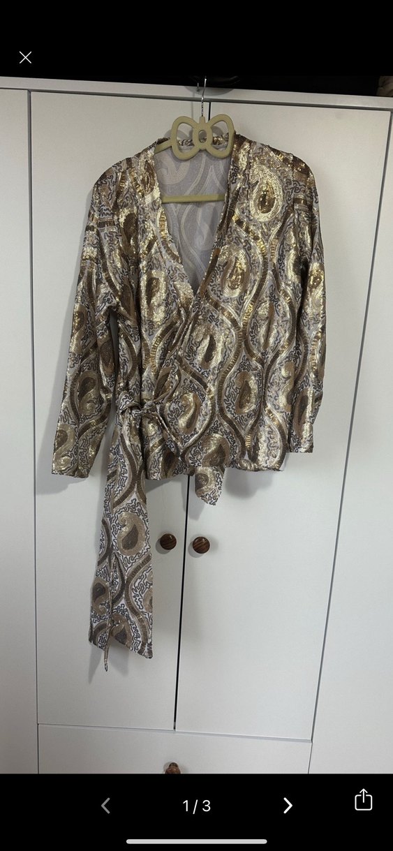 , kuşaklı uzun ve bol kesim kadın ceket.kesik yaka ve vintage bohem tarzıyla ofis şıklığı sunar. Gri ve altın tonları canlılık katıyor. Bir kere kullanıldı. Kuşaklı ve kruvaze model olması sebebiyle bir çok bedene uyum sağlayabilir istenilen şekilde bol ve sıkı bağlanabilir. 40-42 beden