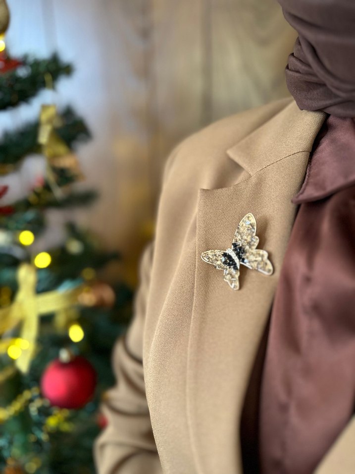 İşlemeli kelebek şeklinde, açık kahverengi düğmeli broş. Klasik şıklık ve günlük sokak stiline uygundur.