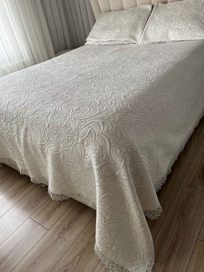 Gri işlemeli desenlere ve ince dantel detaylara sahip beyaz yatak örtüsü, yatak odasına zarif bir dokunuş katıyor. ️