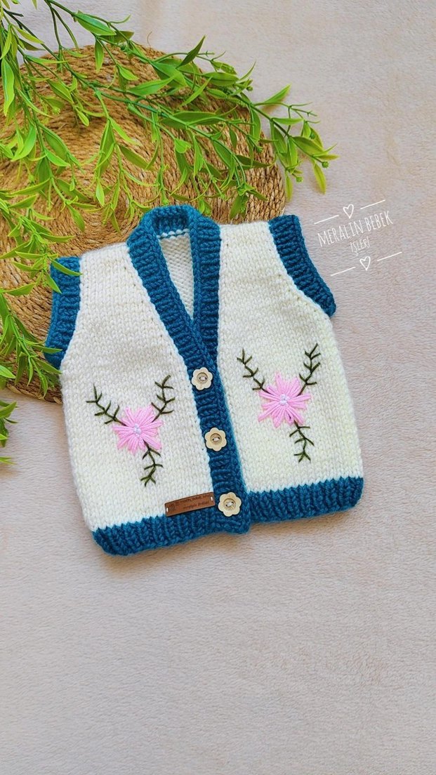 V yaka, kolsuz kız çocuk yeleği, yumuşak örgü kumaştan, Yeşil kenar detaylı ve işlemeli. Bohem tarzını yansıtan rahat kesim. Yenidoğan örgü yelek.