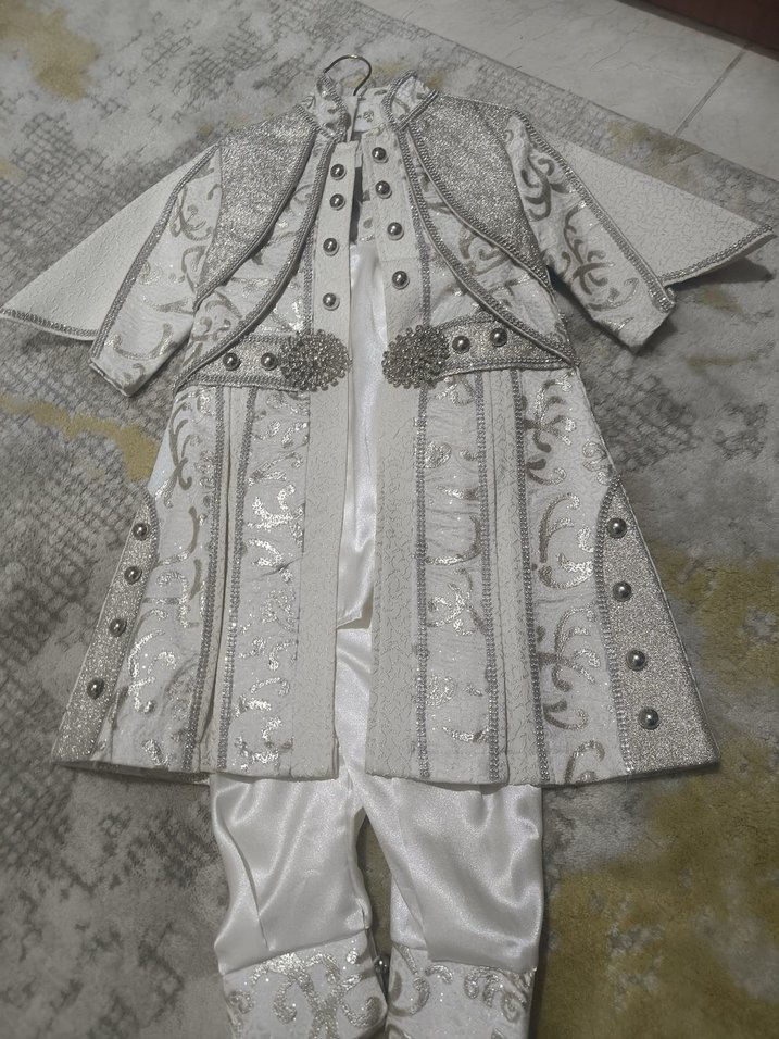 Hiç giyilmedi İşlemeli detaylara sahip beyaz ve gri renkli klasik erkek çocuk kıyafeti. Düğmeli ön ve kesik yaka, regular fit ve kolsuz tasarım içerir.