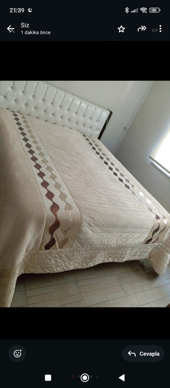 Parlak krem kumaştan, yanlarında zarif dalgalı işlemeli desenler bulunan yatak örtüsü. ️