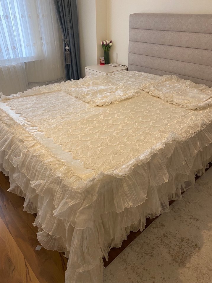 İnce işlemeler ve kat kat fırfırlarla süslenmiş krem rengiyatak örtüsü, yatak odanıza şık bir dokunuş katar. çok az kullanılmış Ftğ için serilmiştir kendı çantasında gönderilecektir uygulamadaki diğer yatak örtülerini göre fiyatı çok uygun çünkü ihtiyacı olana gitsin diye düşük fiyata koydum kalitesi çok iyi