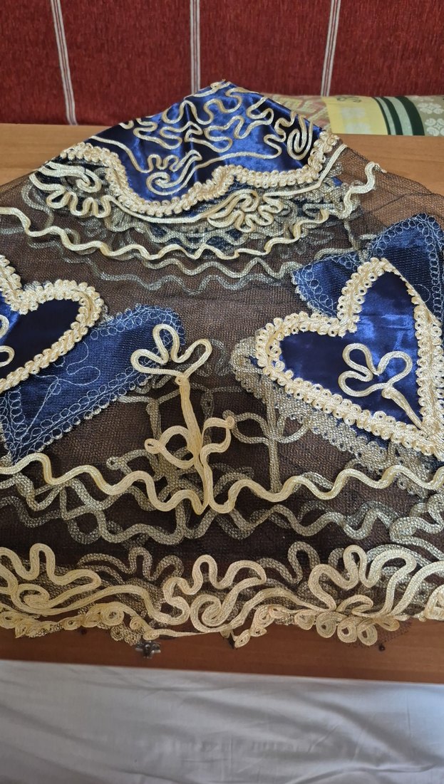 Parlak lacivert saten kumaş ve işlemeli desenlere sahip tül, sutaşı ve saten karışımlı fiskos sehpa yuvarlak sehpa yuvarlak masaya konulabilir